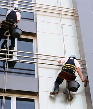 Альпинистами компании осуществляется мытье фасадов зданий, окон после ремонта с помощью различных современных средств: